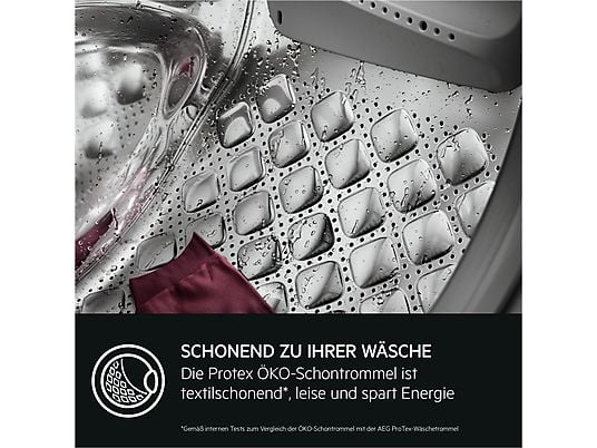 Die AEG ProTex Schontrommel sorgt durch ihre besondere Kissenstruktur für eine schonende Pflege, einen reduzierten Geräuschpegel und einen verbesserten Energieverbrauch. Das Trommelvolumen, die Trommelprägung und die neu gestalteten Mitnahmerippen verhindern ein Aufrauen deiner Textilien.