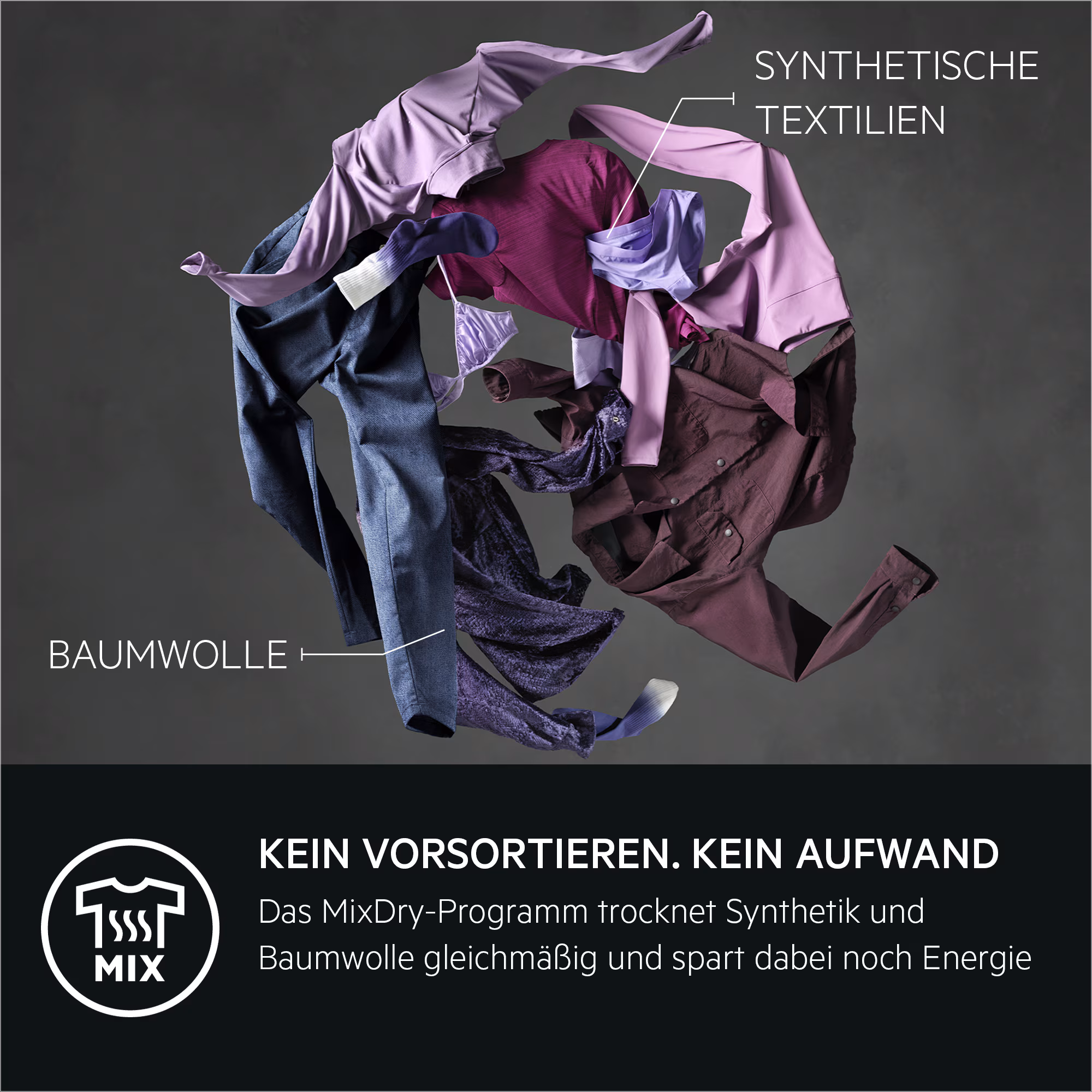 · KEIN VORSORTIEREN - MixDry-Programm trocknet deine Kleidungsstücke aus Synthetik und Baumwolle sorgfältig, gleichmäßig und mit der exakt richtigen Temperatur – nicht zu trocken, nicht zu feucht. Die Wärmepumpentechnologie spart dabei noch Energie