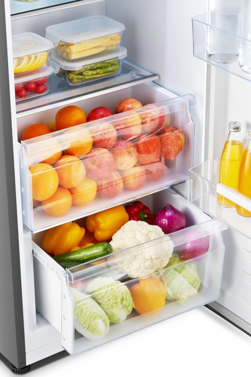 Feuchtigkeitskontrolliertes Fach Ein spezielles Gemüsefach ermöglicht es, die Luftfeuchtigkeit manuell zu regulieren. So bleiben Obst und Gemüse deutlich länger knackig und frisch.