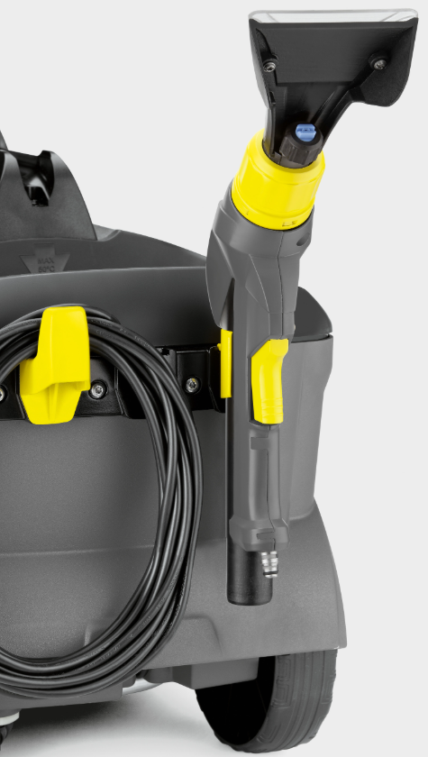 Serienmäßig mit 240-mm-Teppichbodendüse und Polsterdüse zum Einstecken in die Sprüh-/Saugpistole – das Sprühextraktionsgerät Puzzi 10/1 zur Reinigung von Polstern und Teppichflächen.