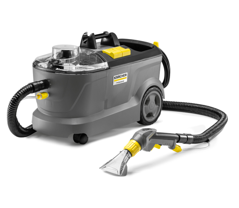 Der professionelle Waschsauger Puzzi 10/1 von Kärcher hat eine sehr gute Rücksaugleistung und ermöglicht hygienische Reinigungsergebnisse sowie eine schnelle Wiederbegehbarkeit von textilen Flächen. Dazu sprüht das Sprühextraktionsgerät die Reinigungslösung tief in die Textilfasern ein, saugt diese anschließend inklusive des gelösten Schmutzes wieder ab und eignet sich so perfekt zur Reinigung von Polstern, Teppichböden und anderen textilen Oberflächen. Die robuste, kompakte Bauweise des Puzzi 10/1 sorgt für eine lange Lebensdauer und damit eine hohe Wirtschaftlichkeit – ideal für Gebäudereiniger, im Hotel- und Gaststättengewerbe oder bei der Fahrzeuginnenreinigung. Zur besseren Sicht auf die Schmutzflotte sind der Gerätedeckel sowie die Polster- und die Bodendüse transparent gehalten. Große, per Hand oder Fuß bedienbare Drucktasten erhöhen den Anwenderkomfort. Zusätzlich ist das Gerät mit einem integrierten Kabelhaken sowie einer Fixierung für Polsterdüse und Saugrohr ausgestattet.