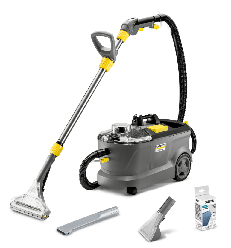 Der professionelle Waschsauger Puzzi 10/1 Edition von Kärcher hat eine sehr gute Rücksaugleistung und ermöglicht hygienische Reinigungsergebnisse sowie eine schnelle Wiederbegehbarkeit von textilen Flächen. Dazu sprüht das Sprühextraktionsgerät die Reinigungslösung tief in die Textilfasern ein, saugt diese anschließend inklusive des gelösten Schmutzes wieder ab und eignet sich so perfekt zur Reinigung von Polstern, Teppichböden und anderen textilen Oberflächen. Die robuste, kompakte Bauweise des Puzzi 10/1 Edition sorgt für eine lange Lebensdauer und damit eine hohe Wirtschaftlichkeit – ideal für Gebäudereiniger, im Hotel- und Gaststättengewerbe oder bei der Fahrzeuginnenreinigung. Zur besseren Sicht auf die Schmutzflotte sind der Gerätedeckel sowie die Polster- und die Bodendüse transparent gehalten. Große, per Hand oder Fuß bedienbare Drucktasten erhöhen den Anwenderkomfort. Das im Lieferumfang enthaltende Zubehör ist besonders umfangreich: 240-mm-Teppichbodendüse, Polsterdüse, Fugendüse und dazu noch 48 Tabs RM 760.